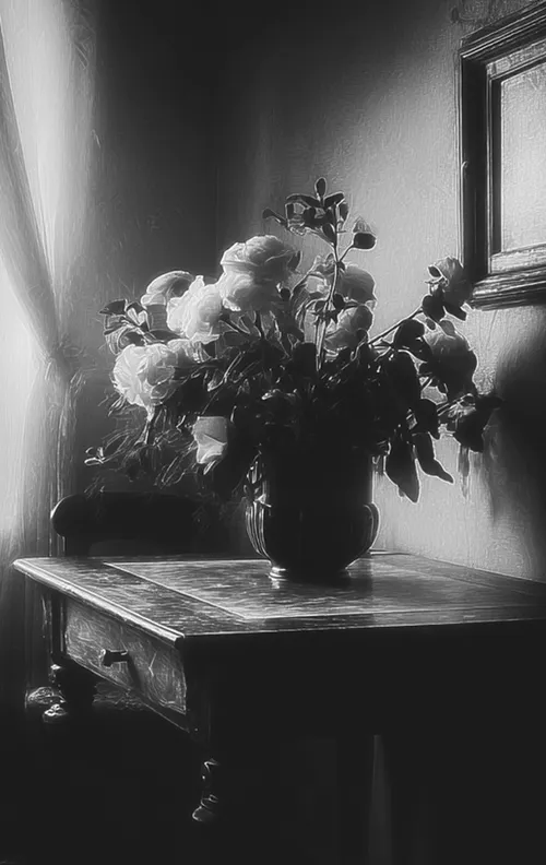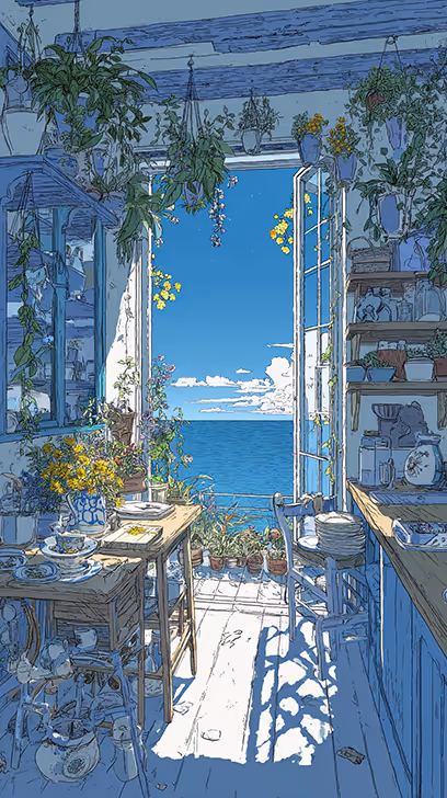 Prompt: A highly detailed and delicate line-art illustration of a sunlit coastal kitchen in a seaside Mediterranean-style home. The kitchen is filled with vibrant potted plants and flowers, especially hanging vines and blooming blossoms.