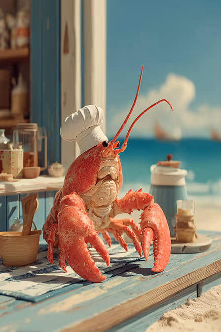 Prompt: Hello cartoon, a funny lobster sits in a chef's hat, in the background is the sea and the beach